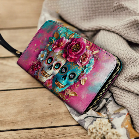 Leather Wallet With Wristlet Strap Handle Sugar Skull Love
