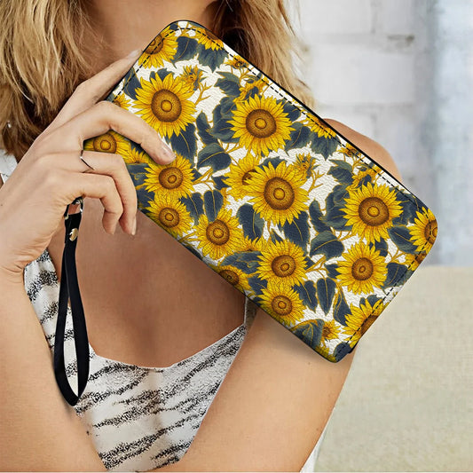 Leather Wallet With Wristlet Strap Handle Sunflower Blooming With Grace