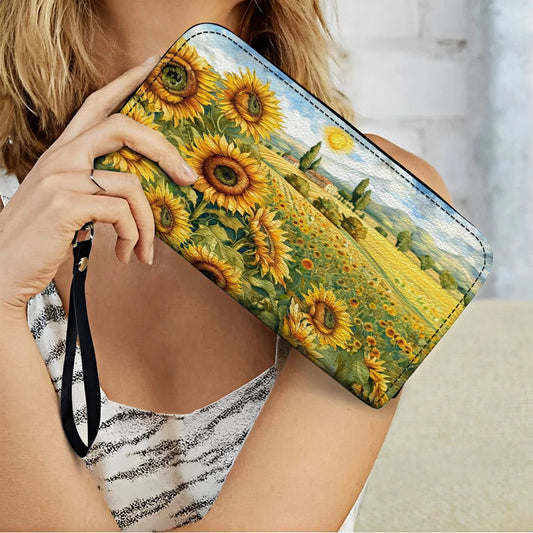 Leather Wallet With Wristlet Strap Handle Sunflower Elegance