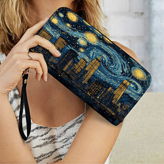 Leather Wallet With Wristlet Strap Handle Starry Skyline