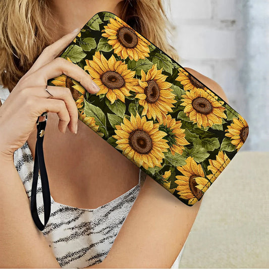 Leather Wallet With Wristlet Strap Handle Sunflower Serenade