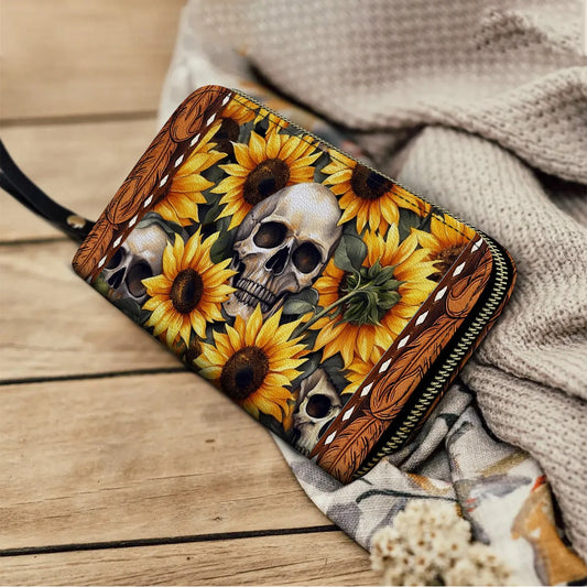 Leather Wallet With Wristlet Strap Handle Sunflower Skull