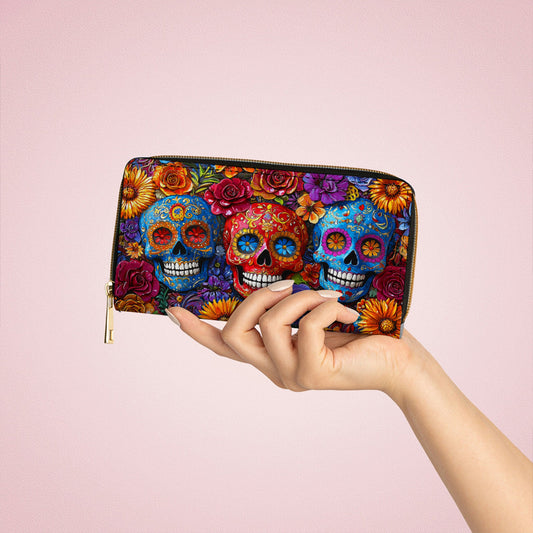 Leather Wallet With Wristlet Strap Handle Vibrant Sugar Skull