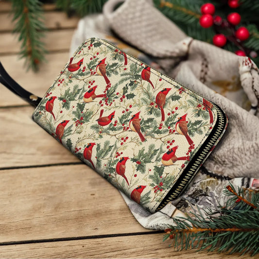 Leather Wallet With Wristlet Strap Handle Winter Cardinal Harmony