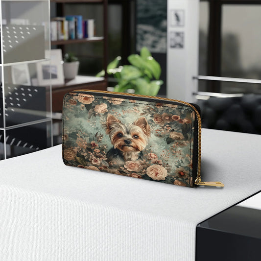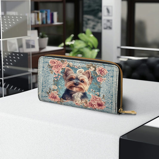 Leather Wallet With Wristlet Strap Handle Yorkie Rose Bloom Elegance